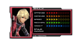 By standard, Shulk is a character with very balanced stats, with average movement speed, however with a somewhat slow mobility in the air, as well beingness a heavyweight. His Monado grants him the highest overall range of all characters in the game. Additionally, the Monado deals more than impairment and knockback if it hits from the centre of the energy blade rather than the tip. This is more noticeable in his Smash Attacks.